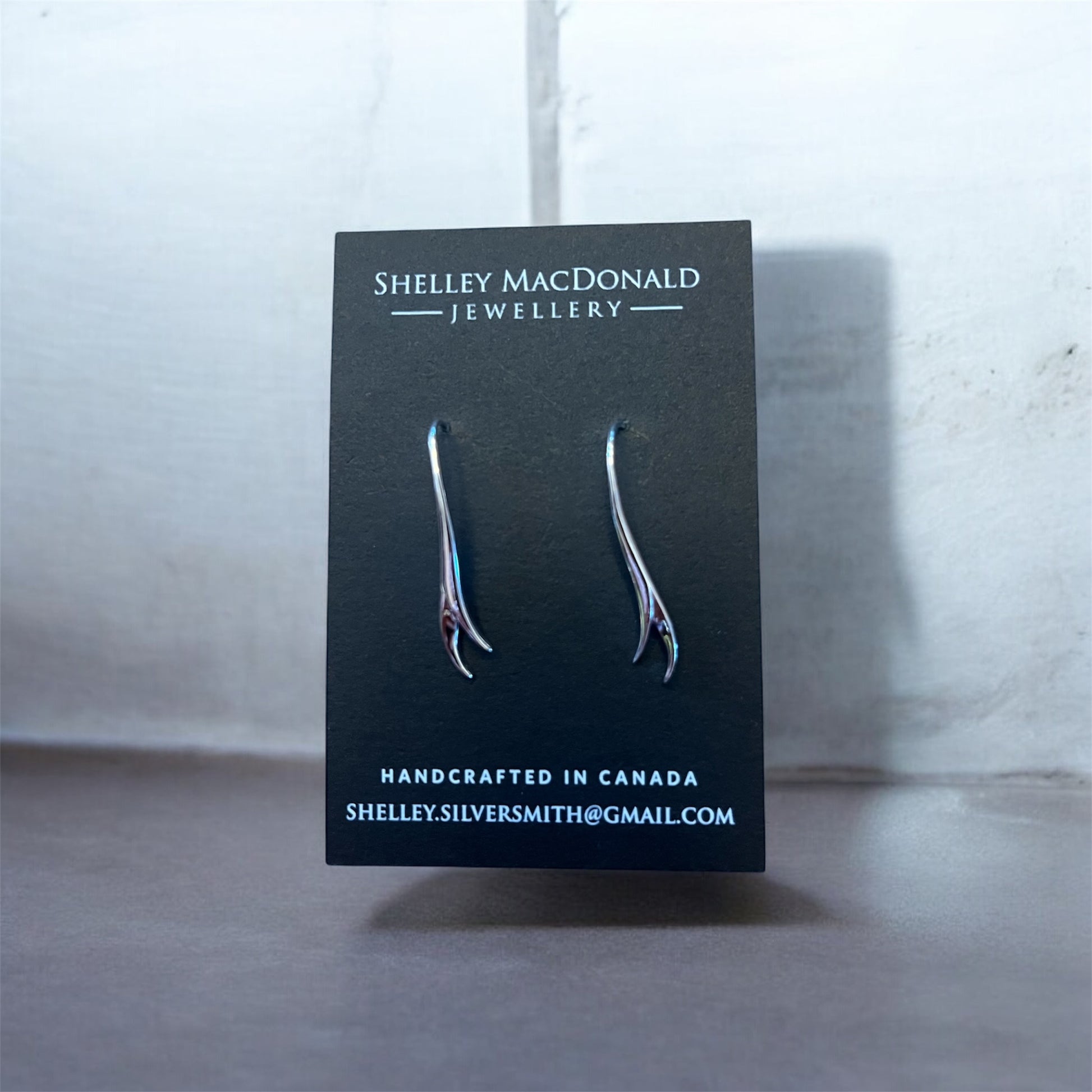 Unique sterling silver modern antler dangle earrings by Shelley MacDonald Jewellery Designer. Inspired by nature, these contemporary earrings feature an artistic antler design that's both bold and elegant.
