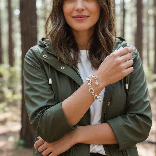 Intertwined with sophistication, our infinity bracelet exudes a casual elegance. Crafted from shining .925 sterling silver, the infinity symbol links represent eternal love while connected to the abstract oval findings with double ring adds a touch of modernity. A perfect metaphor for the endless possibilities of the future.